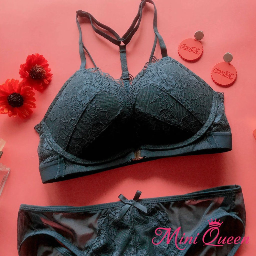 前扣內衣【獨家】魔幻VIVI_Mini Queen性感深溝前扣式細帶蕾絲美背成套內衣 (藍綠 65-90 A-G)