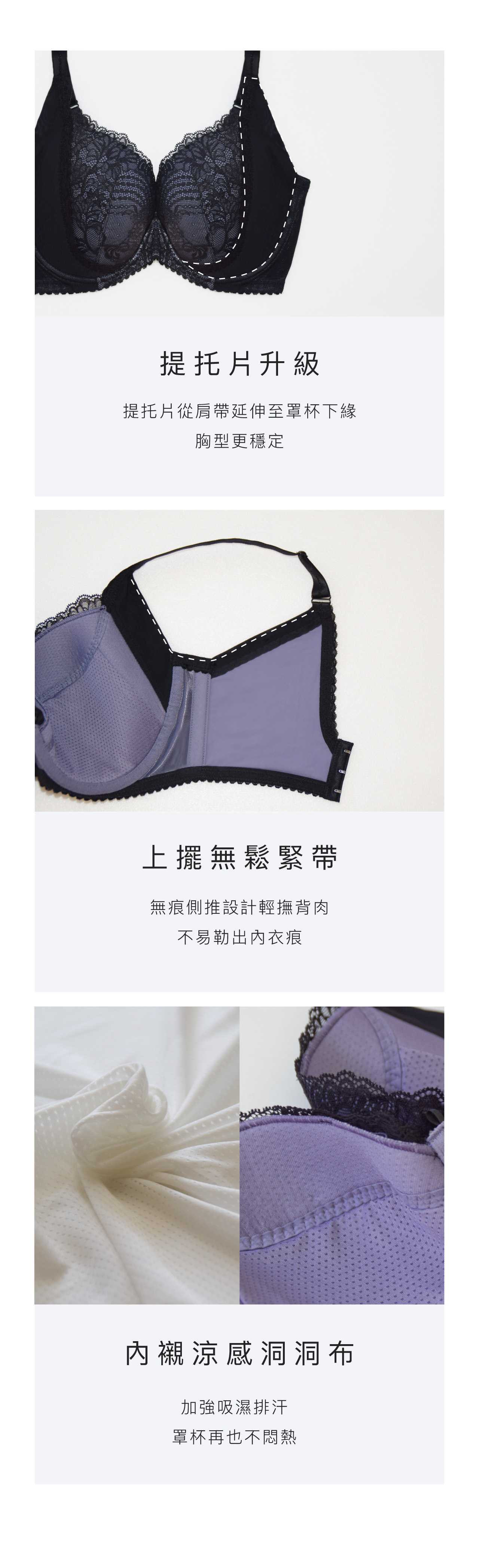從脇側至罩杯下緣,360 度提托收攏胸部肉肉舉手投足間更安定。