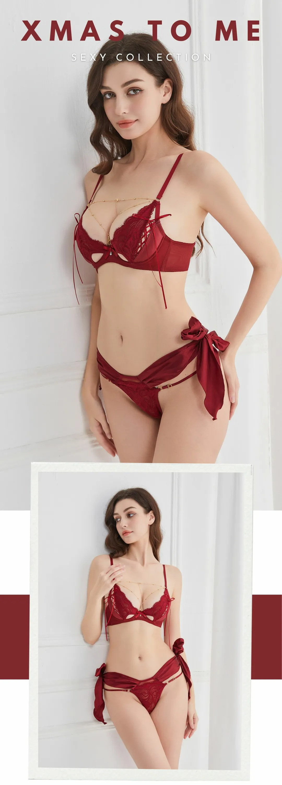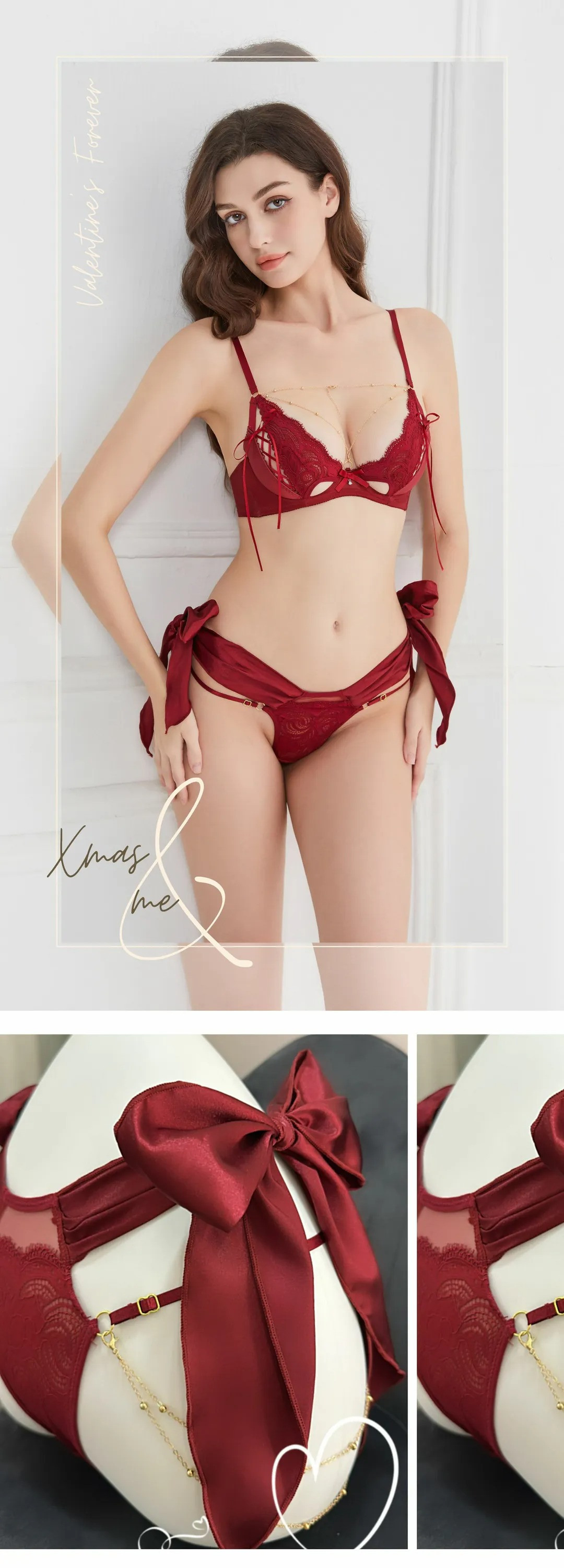 l獨家l Xmas to me 薄蕾絲鏤空套裝 櫻桃紅