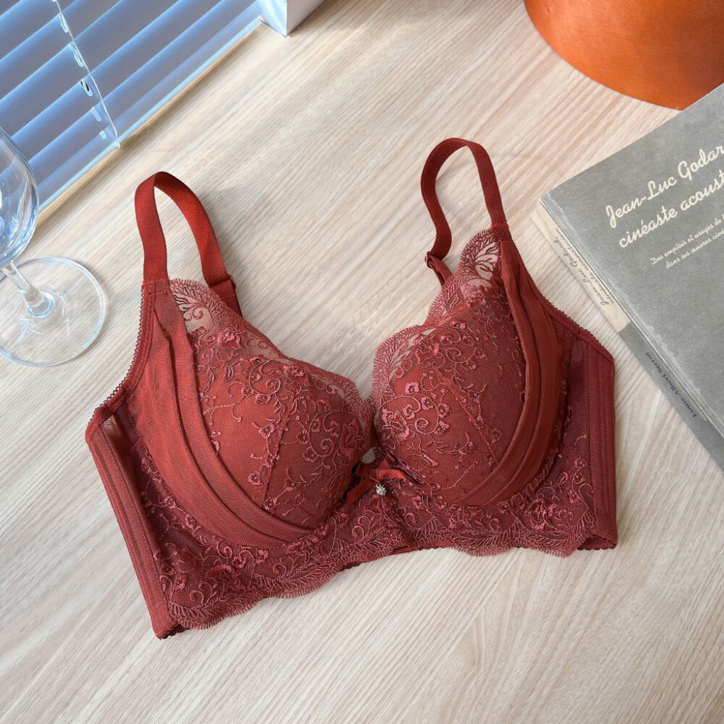 成套內衣【獨家】名媛Lulu-Mini Queen 美胸拉提滿版刺繡緹花蕾絲機能包覆軟鋼圈調整型成套內衣褲(酒紅色65B-95E)