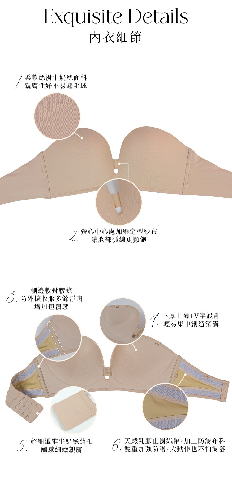 ✦脊心中心處加縫的定型紗布,讓胸部弧線更顯飽,極致乳溝湧現
