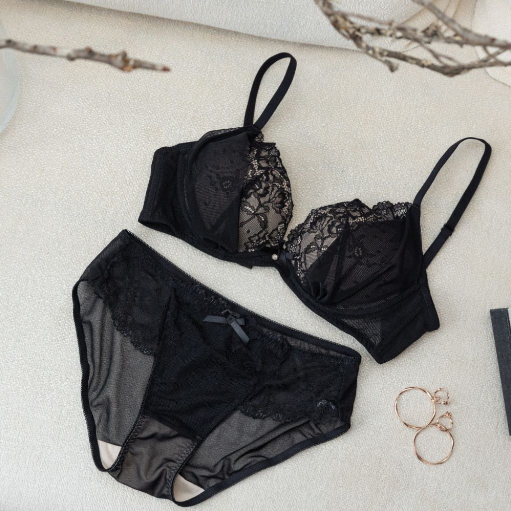 軟鋼圈【獨家】情牽布莉-Mini Queen拉提雪紡軟紗透膚精緻蕾絲淺杯軟鋼圈成套內衣褲(黑色65B-95F)