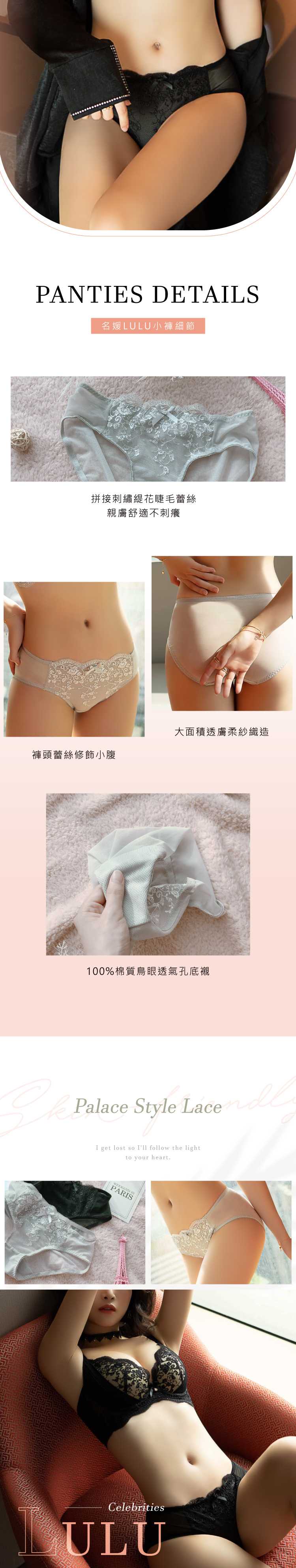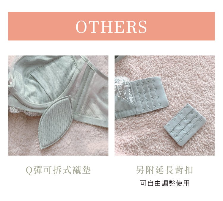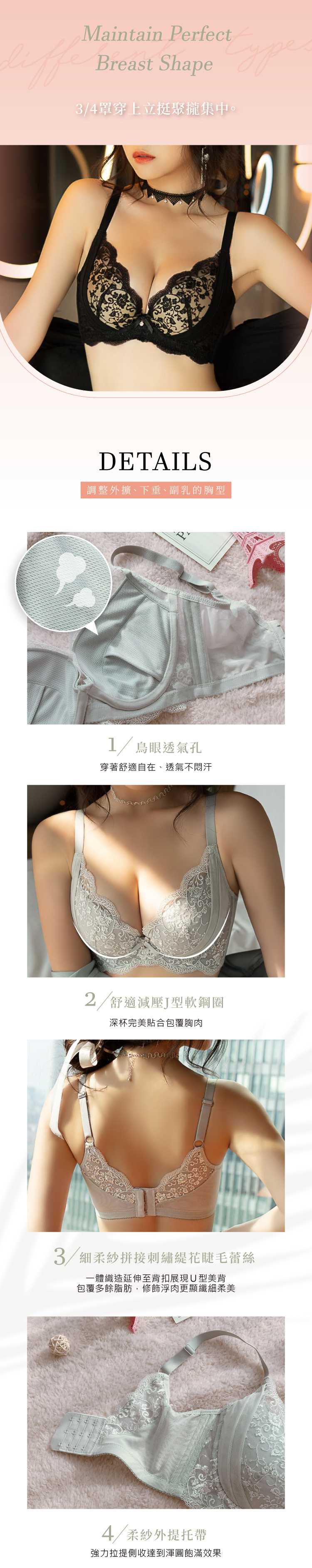 POINT [3] 【細柔紗拼接刺繡緹花睫毛蕾絲】一體織造延伸至背扣展現U型美背,包覆多餘脂肪,修飾浮肉更顯纖細柔美