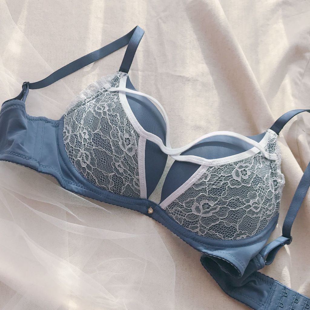 成套內衣【獨家】爆爆BABY_Mini Queen性感交叉細帶L型鋼圈集中托高日系成套內衣褲 (灰藍65-95A-H)