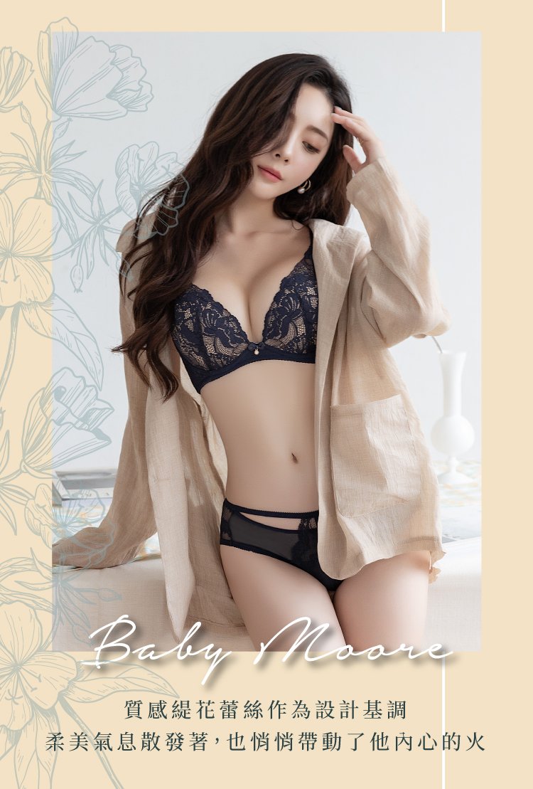 軟鋼圈baby莫兒-Mini Queen質感緹花性感交叉美胸澎澎杯成套內衣褲 (神秘藍65B-95F )
