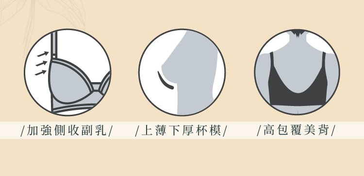 三角緹花蕾絲內層固定肩帶有助拉提胸部,加強側收副乳。
