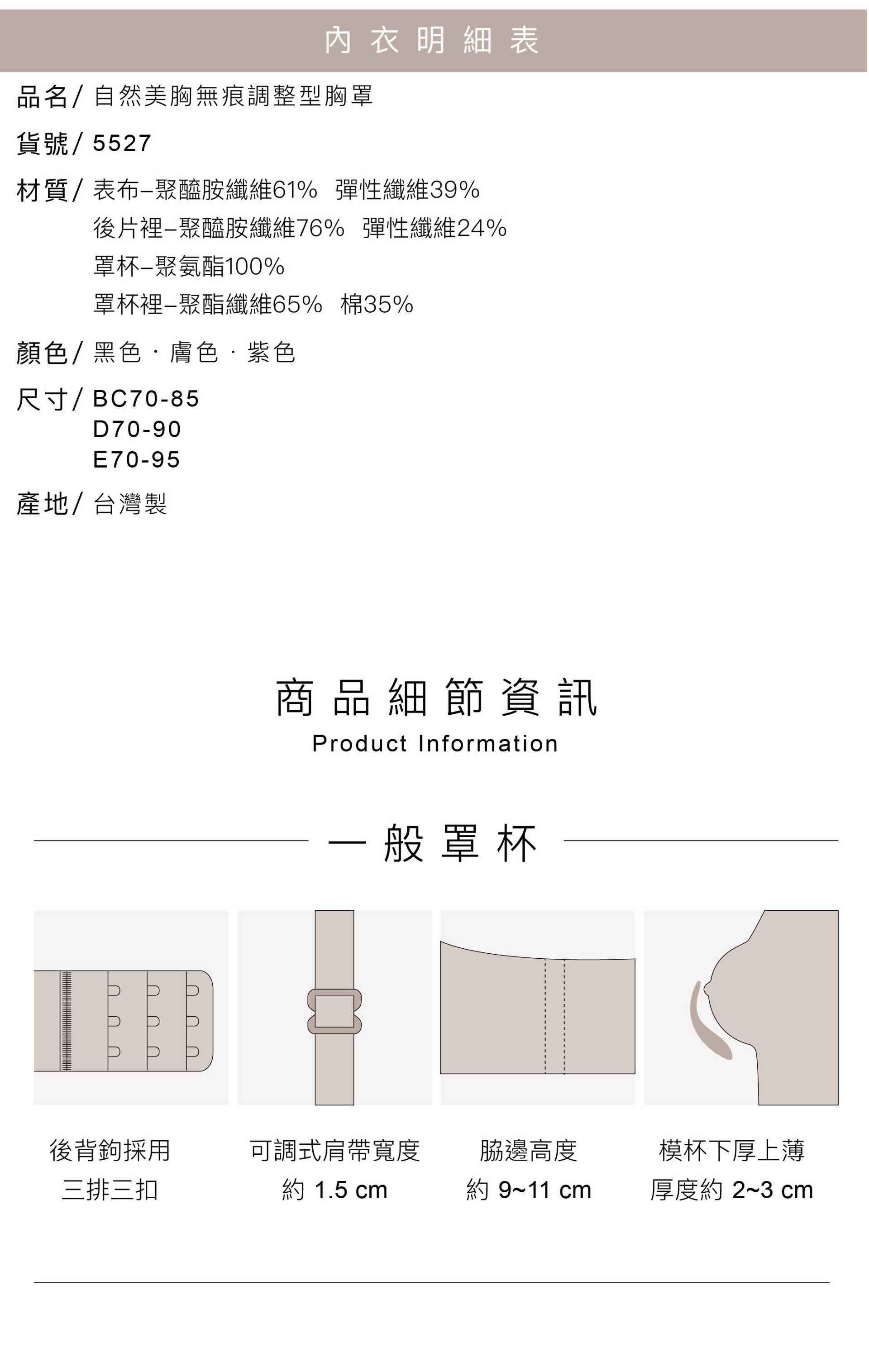罩杯採質地柔滑的一體成型設計。70B~80B.70C~75C罩杯尺寸內有上薄下實的襯墊,