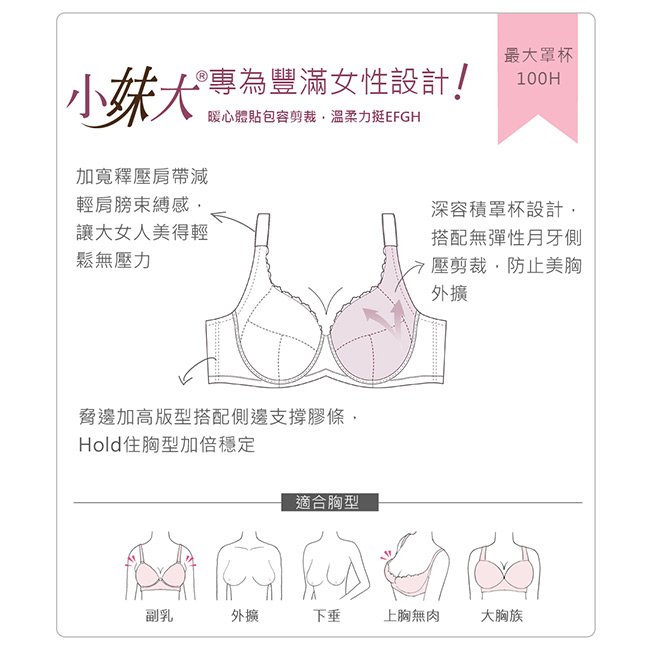 ∣穩定好包覆∣脅邊加高設計,包覆副乳防外擴,給大女人最包覆的安全感!